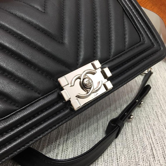 CC 25cm Boy Handbag Calfskin Silver Tone Metal Black