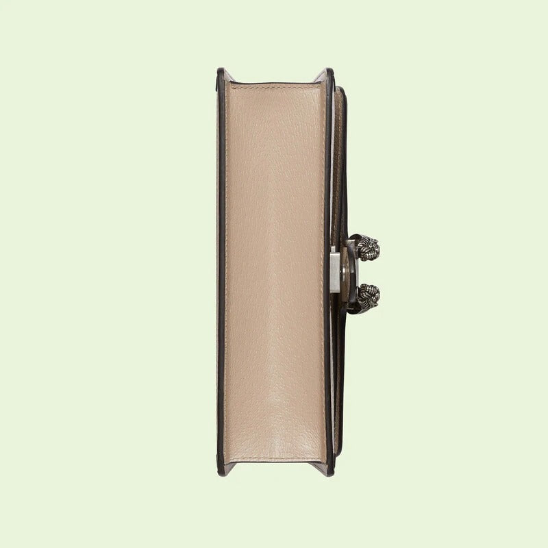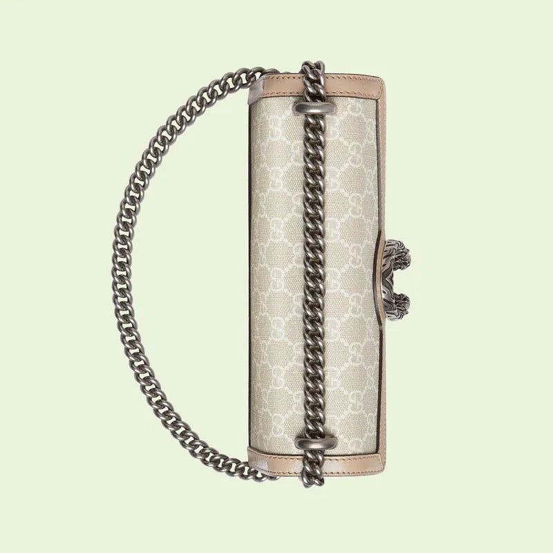 A heritage material from the archive. GG Supreme has been reimagined in GG Love Parade in different color combinations and combined with contemporary as well as classic styles. The Dionysus is presented in a beige and white variation of the signature material with a tonal trim. Originally a play on a '30s design. the canvas speaks to the historical narrative that runs throughout the collection.