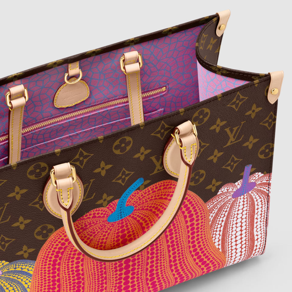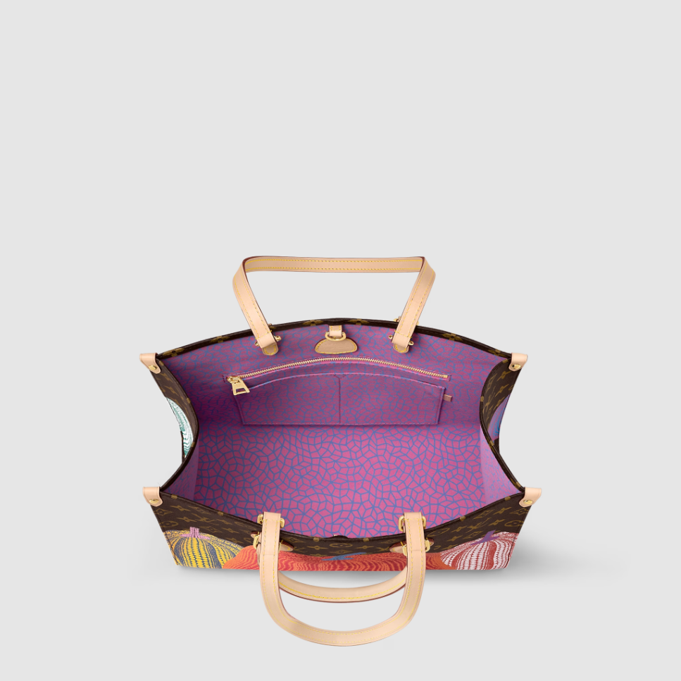 Featured in the exceptional new L x Yayoi Kusama collection. this version of the LVxYK OnTheGo MM was inspired by a key theme in the celebrated Japanese artist’s work: pumpkins. a symbol of comforting warmth. Monogram canvas is printed with a row of stylized pumpkins in cheerful colors. punctuated with Kusama’s signature dots. A handy. capacious bag that’s sure to become a collector’s piece.