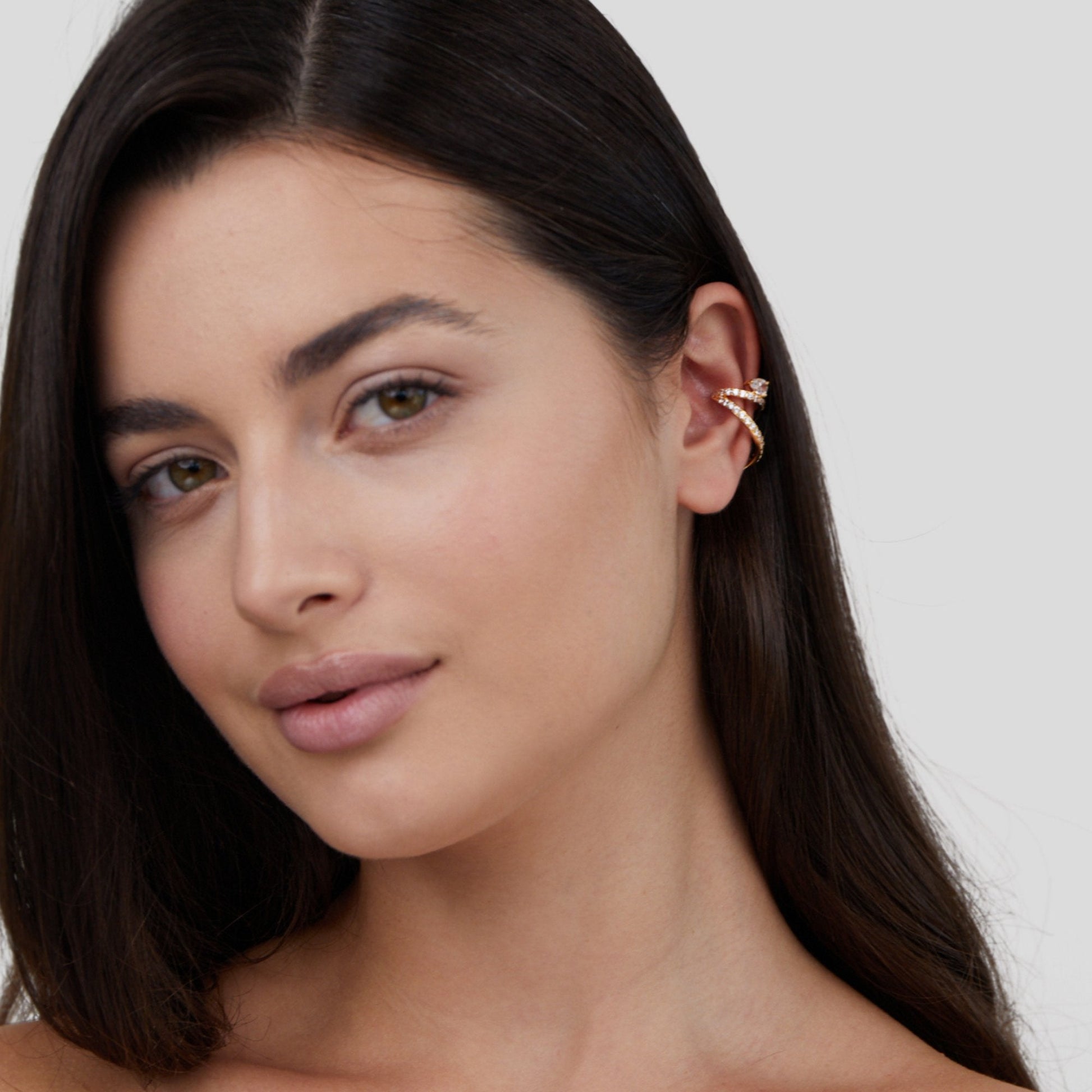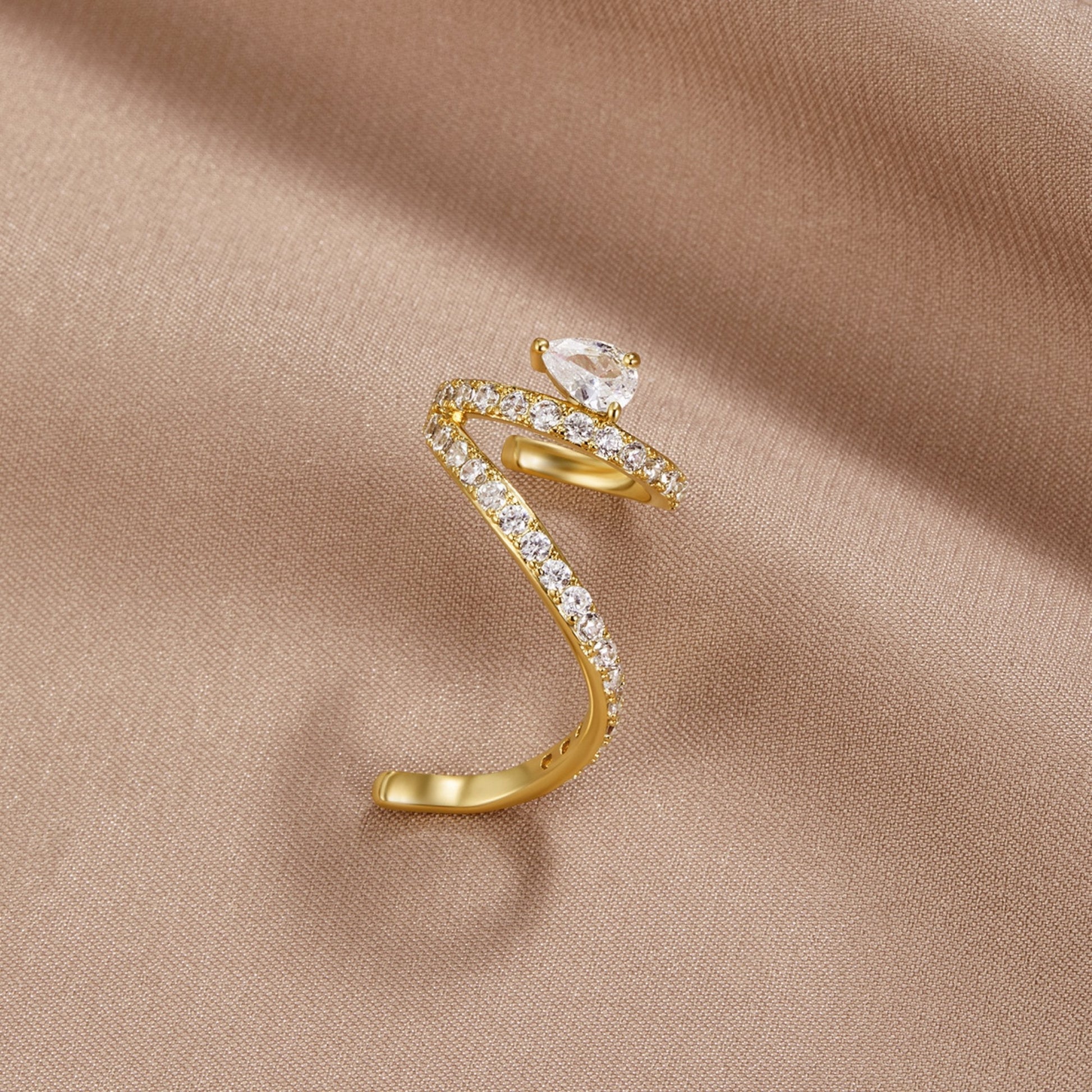 Add a unique twist to any look with this stunning 1 piece (left) 18K Gold Crystal Earring Cuff. Designed to wrap around your ear for comfort and style.