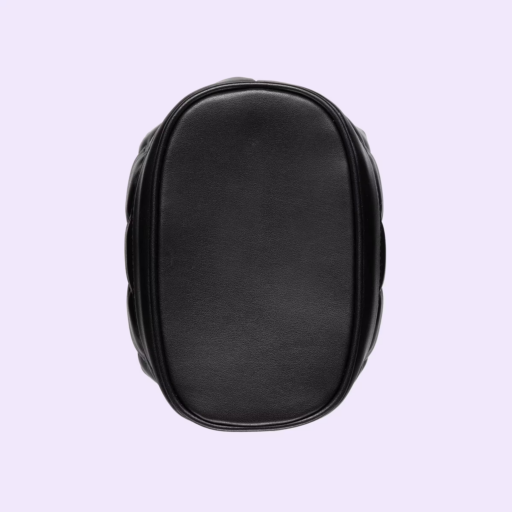 Matelassé leather is a signature material of the House. thanks to its super soft finish. The textured GG motif defines a selection of handbags. including this black leather bucket bag. The Double G hardware decorates the front. continuing the logo feel of the design.