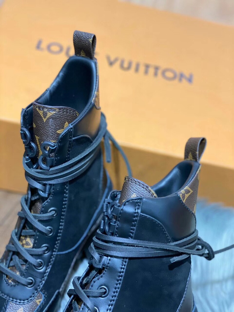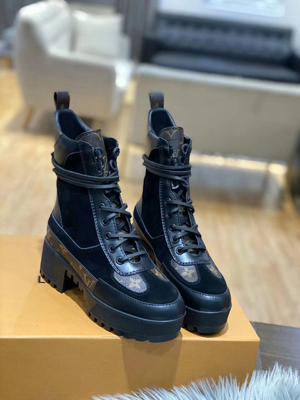 Platform construction and treaded rubber outsole. the Laureate desert boot is one of L's most recognizable styles. Crafted from trim in iconic Monogram material. this version combines a go-anywhere spirit with true fashion appeal.