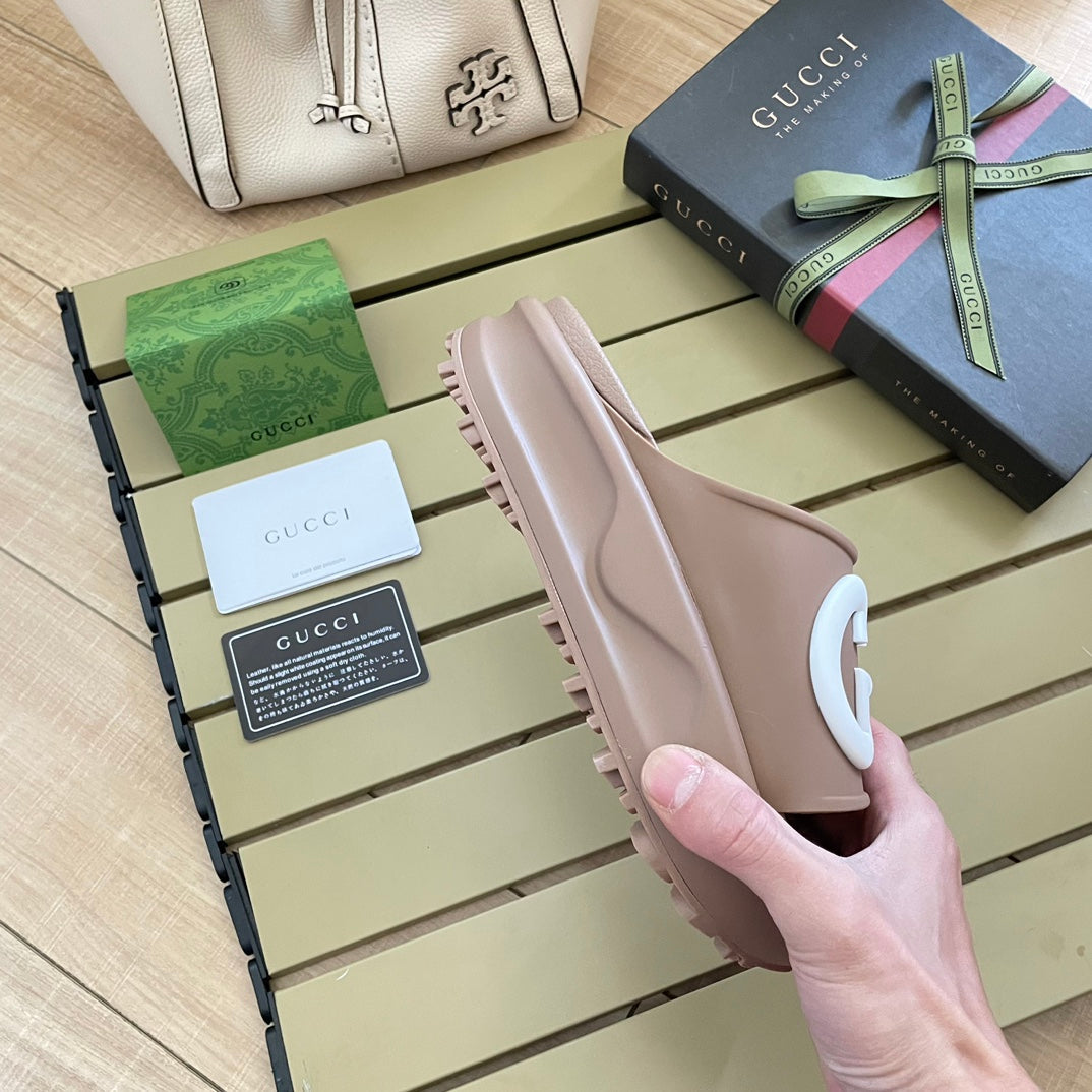 - Influenced by an archival design from the '70s-a hallmark era of the House. the Interlocking G appears as an embossed detail atop this brown rubber sandal. An ode to timeless elegance. latest collection explores archival symbols in new ways.