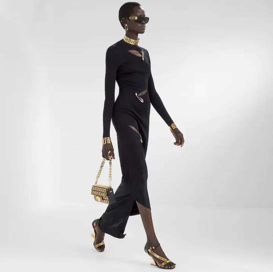 Iconic. boxy mini Baguette bag from the Versace by Fd collection. Made of black leather embellished with all-over applied metal FF motif. FF closure with black plexiglass and Versace Medusa detail. Featuring a front flap. magnetic clasp. gold laminated leather-lined internal compartment. inner pocket and gold-finish metalware.