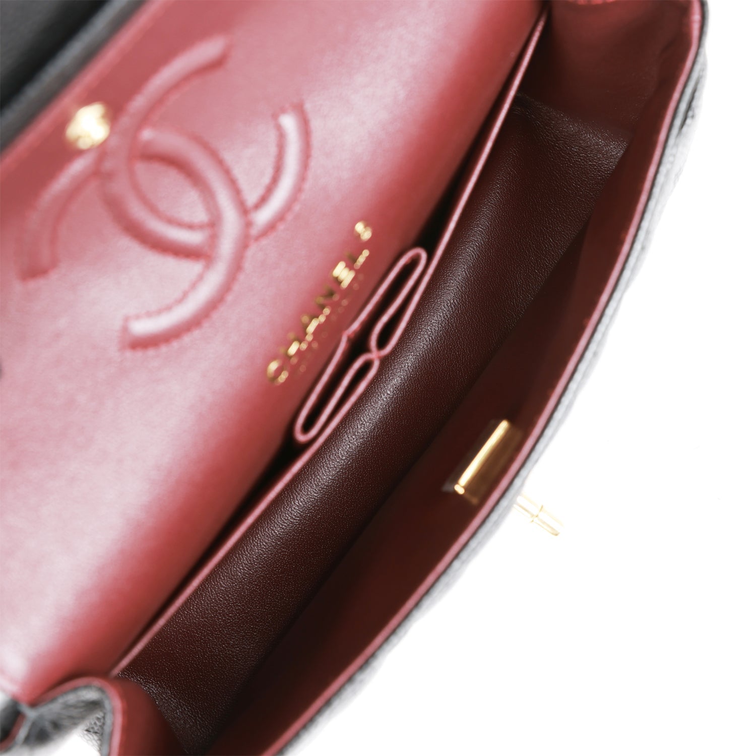 The interior is lined in burgundy leather with the "love letter" zipper compartment underneath the first flap.?an "outer" slit pocket under the second flap. and an interior compartment with two open pockets separated by a "lipstick" compartment.