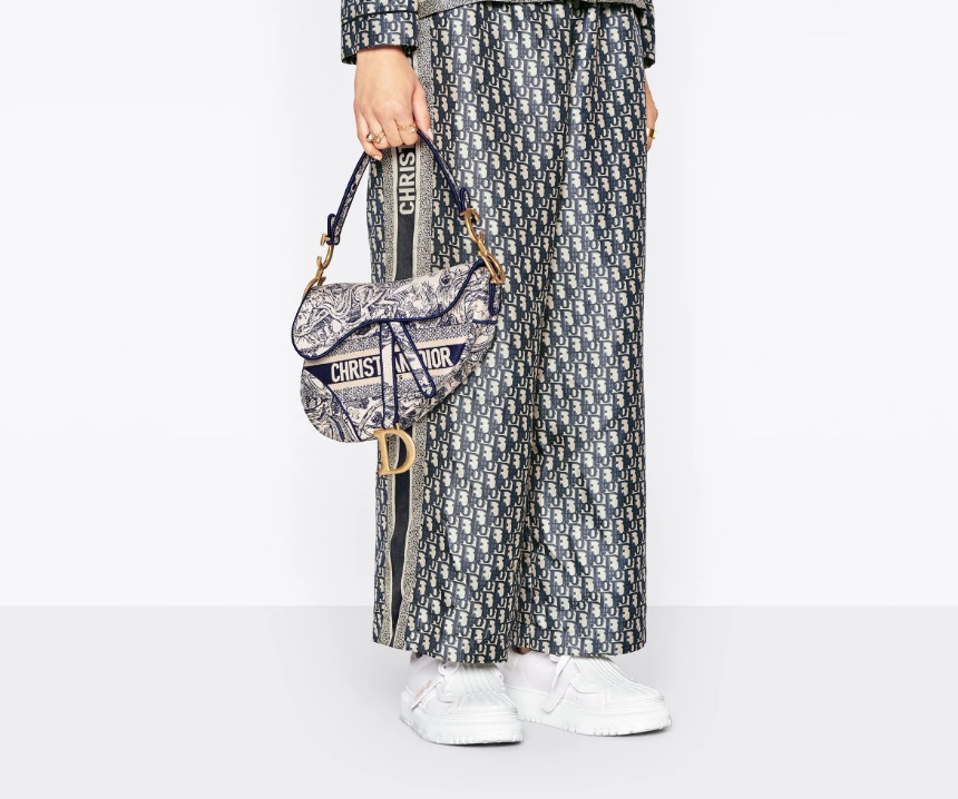 Maria Grazia Chiuri brings a fresh update to the iconic Saddle bag. The design is fully embroidered with the hallmark blue Toile de Jouy motif, further enhanced by a 'CHRISTIAN DIOR' signature on the front. The legendary design features a Saddle flap with a magnetic 'D' stirrup clasp and boasts an antique gold-finish metal 'CD' signature on each side of the handle. The bag can be customized with different shoulder straps and may be coordinated with the season's other Toile de Jouy creations.