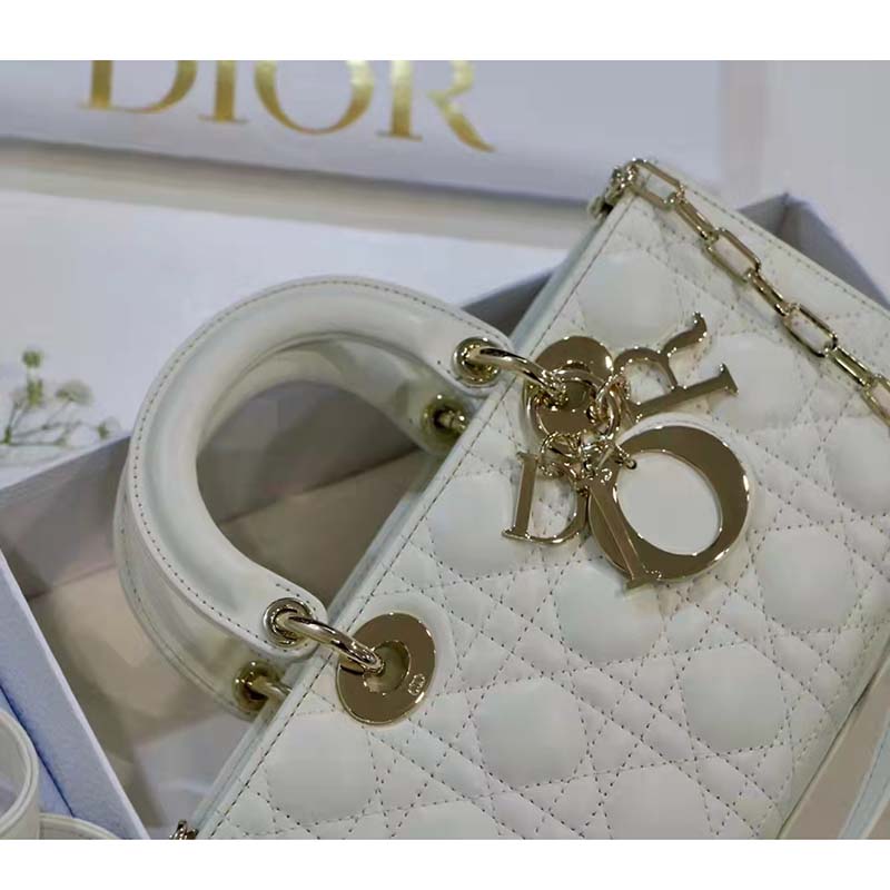 Featuring one removable chain shoulder strap and another adjustable and removable leather shoulder strap. the Lady D-Joy bag can be carried by hand. worn over the shoulder or crossbody as a daily companion.