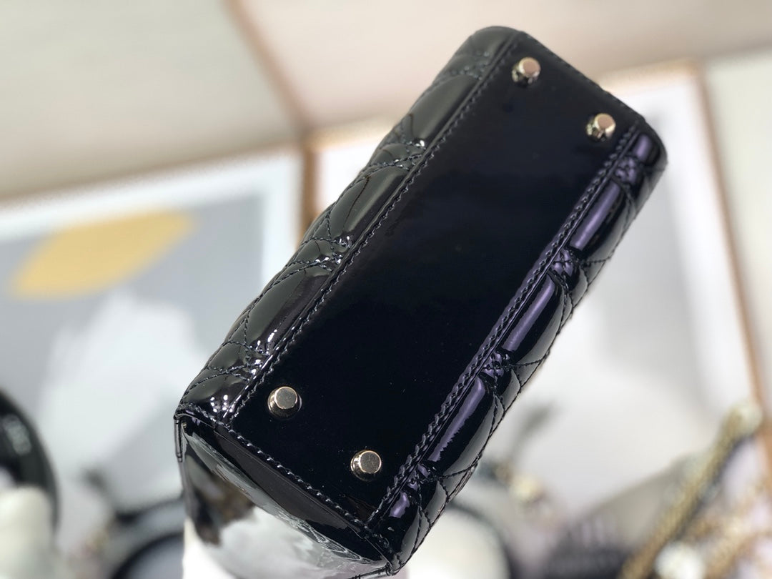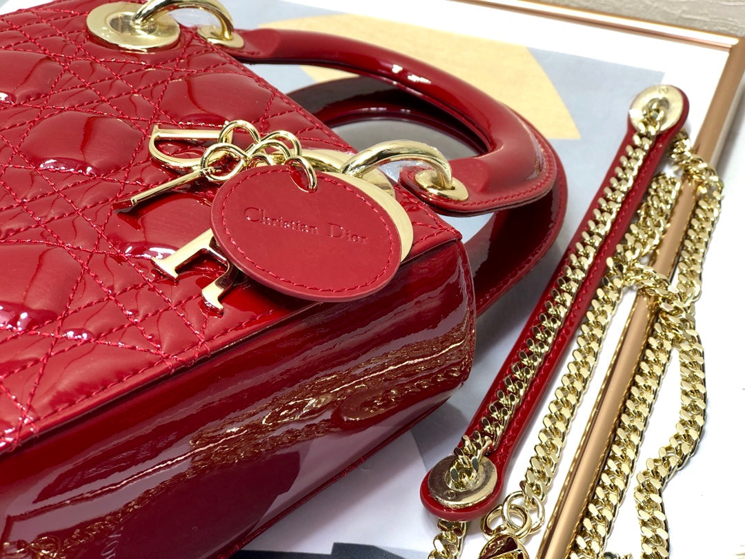 The Lady CD My ABCCD bag epitomizes CD's vision of elegance and beauty. Sleek and refined. the timeless and modern style is crafted in cherry red patent calfskin with Cannage stitching. creating the instantly recognizable quilted texture. Pale gold-finish metal 'D.I.O.R.' charms further embellish its silhouette with an elegant allure. The small style features a thin. removable leather shoulder strap and can be carried by hand. worn over the shoulder or crossbody.