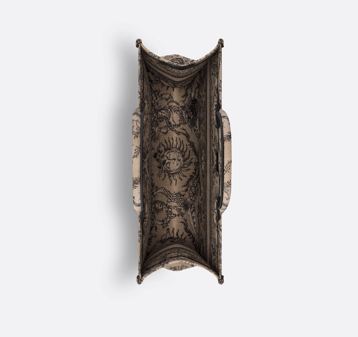 Introduced by Maria Grazia Chiuri, Creative Director of CD, the D Book Tote has become a staple of the D aesthetic. Designed to hold all the daily essentials, the style is fully embroidered with the season's signature Toile de Jouy Soleil motif in beige and black, offering a new take on the iconic House motif with suns and crescent moons layered into a floral design representing the four seasons. Exemplifying House savoir-faire, the large tote is adorned with the CD Paris signature on the front, and may be carried by hand or worn over the shoulder.