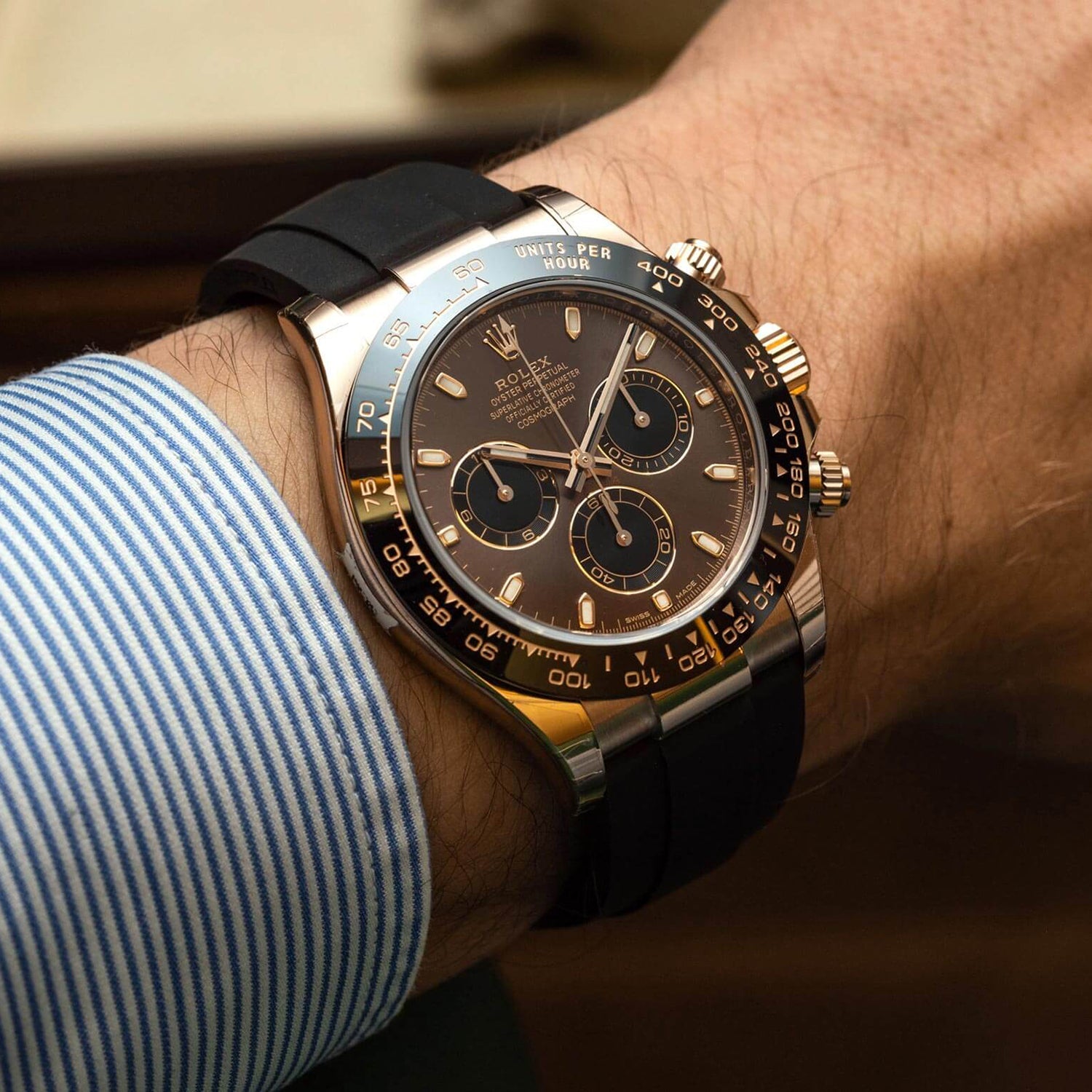 Fitted to the 'best in class' waterproof rubber Oysterflex bracelet. this immensely sought-after precious metal Daytona is brand new.