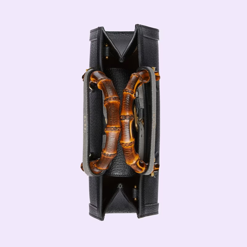 A new shape for GG Cosmogonie. the GG Diana continues to combine recognisable elements of the House with the bamboo handles and Double G hardware. Crafted from black leather. the accessory is further accentuated by two decorative leather belts. a playful reference to the bands used to keep handles in shape.