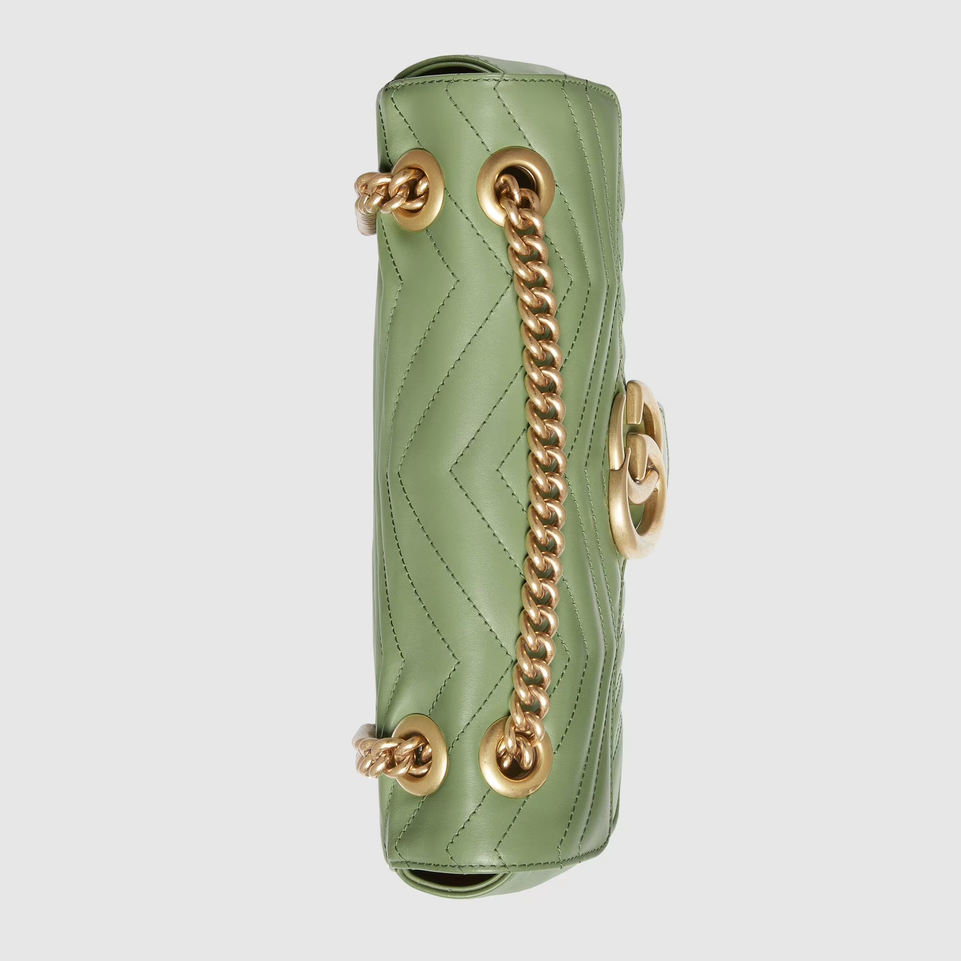 The softly structured shape of the small GG Marmont chain shoulder bag is defined by the antique gold-toned Double G hardware. The sliding chain strap can be worn multiple ways. changing between a shoulder and a top handle bag. Crafted in matelassé leather. it's enriched with curved patterns that play with fresh geometries.