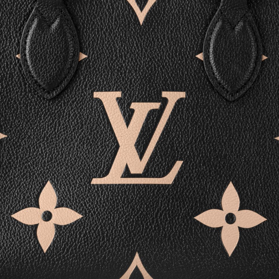 Inspired by L’s famous Sac Plat from 1968. the OnTheGo PM tote is fashioned in Monogram Empreinte leather. embossed with a Medium Bicolor Monogram pattern. This smaller version of the original OnTheGo fits essentials such as an iPad Mini. Articulated top handles and an adjustable removable strap offer a variety of carry options.