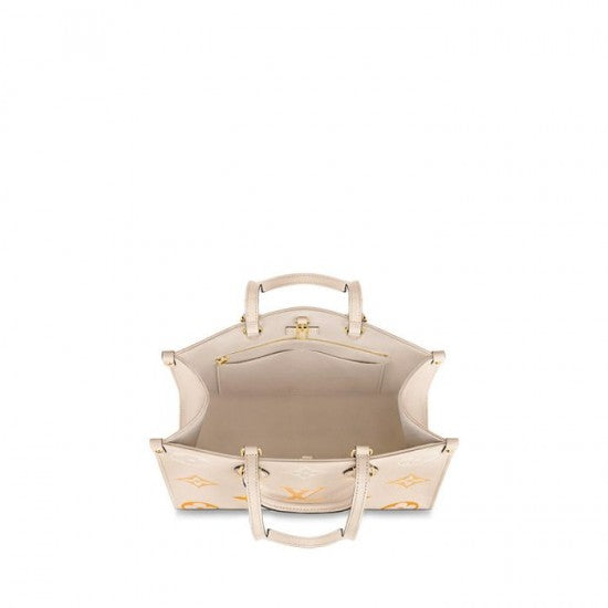 Made from a Monogram Empreinte leather with a subtle colour gradient on the embossed Monogram pattern. the emblematic OnTheGo MM tote bag is part of the By The Pool capsule collection. It has two sets of handles. long and short. for hand and shoulder carry and a spacious interior. which easily fits essentials such as a laptop. A leather charm gives a playful spirit and highlights the craftsmanship.