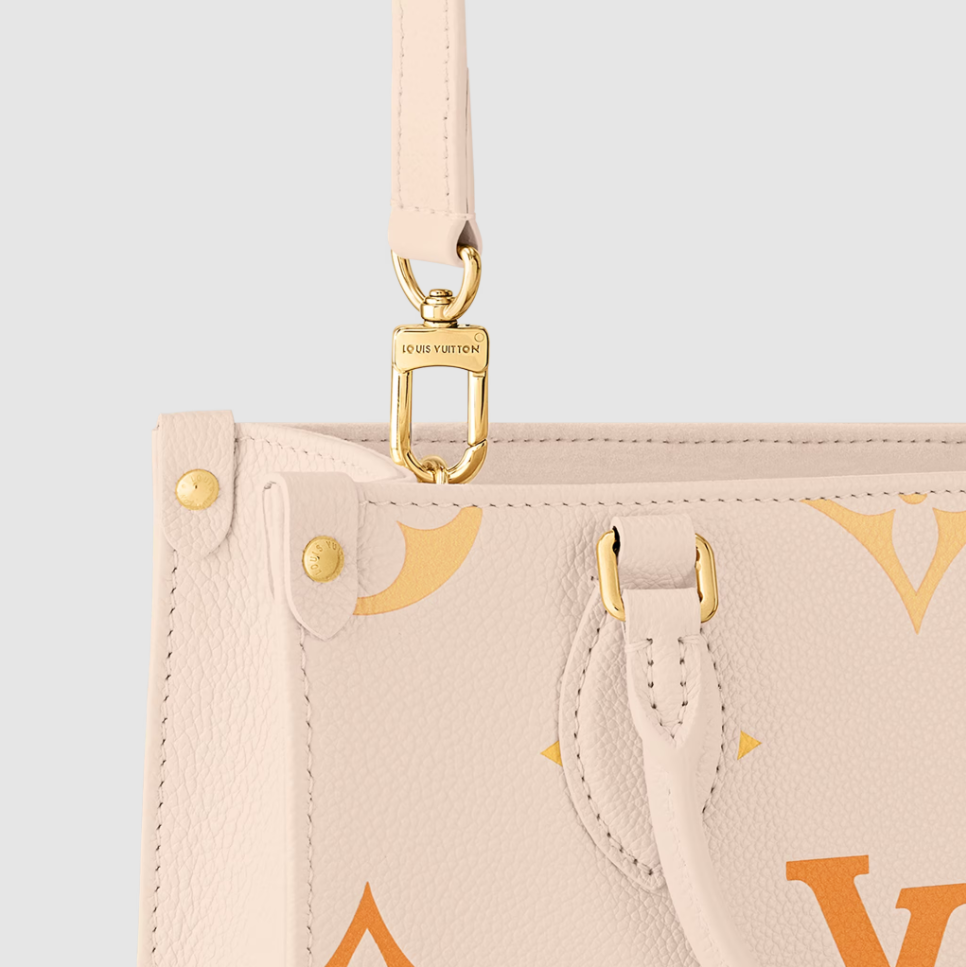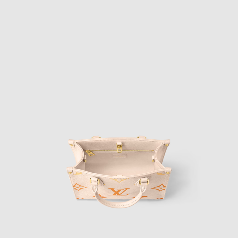 Fashioned from in supple Monogram Empreinte leather with its and embossed with a and printed extra-large Giant Monogram motif. the OnTheGo PM is a compact tote bag offering with a fresh gradient colorway for the summer. It has two rolled-leather top handles for hand carry and a removable and adjustable strap for shoulder or cross-body wear. Inside there’s a zipped pocket will fit daily essentials. for valuables.