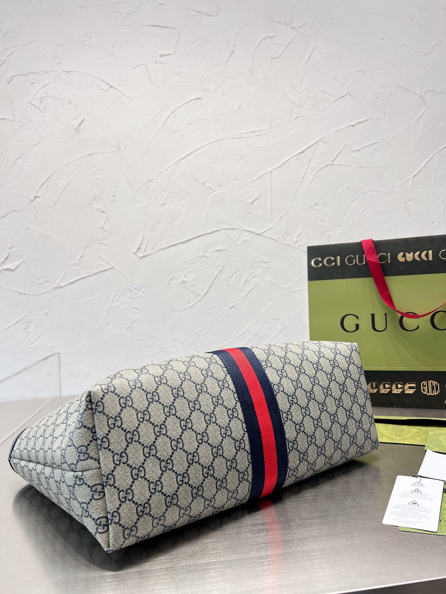 Mirroring the material's historic origins. GG Supreme is introduced in a timeless mix of blue and beige for Gc Love Parade. The canvas has come to the front of each collection decade after decade to become a hallmark of the House. Here. the classic palette defines this medium-sized Ophidia tote bag. completed by the Web stripe in red and blue.